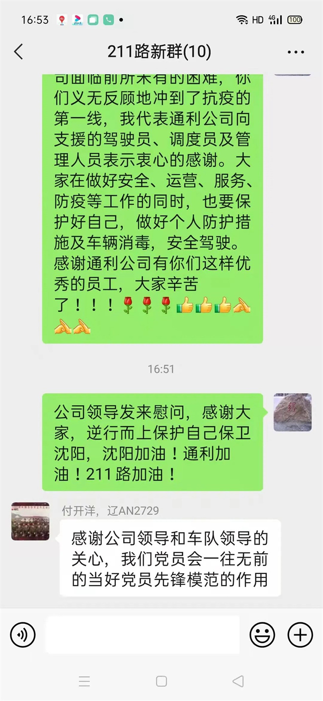 面對駕駛員的辛苦付出,公司通過微信群,向支援的駕駛員表達了公司的關心與慰問。大家說,看到公司的問候和關心,心里特別溫暖。駕駛員付開洋說:“感謝公司的關心,一定會一往無前發(fā)揮黨員先鋒模范作用。”