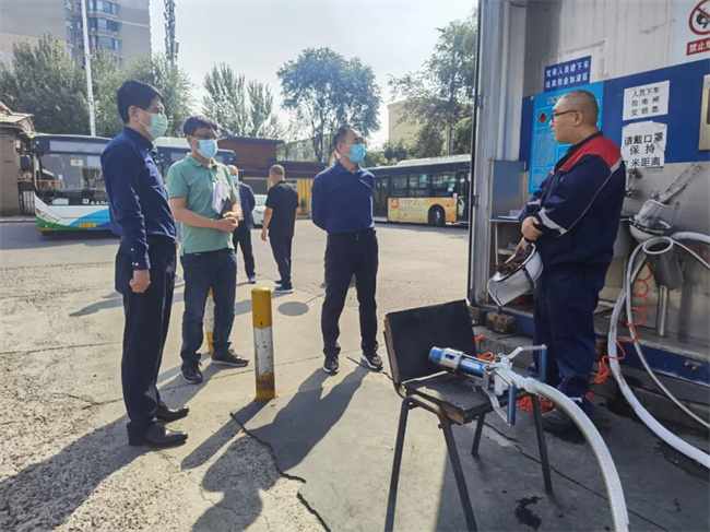 在通利公司場區(qū)院內(nèi),段九州副總經(jīng)理檢查了場區(qū)院內(nèi)公交車輛的安全設(shè)施,車輛充電設(shè)施,第三方加氣站周邊情況,場區(qū)內(nèi)疫情防控舉措及實(shí)施情況。