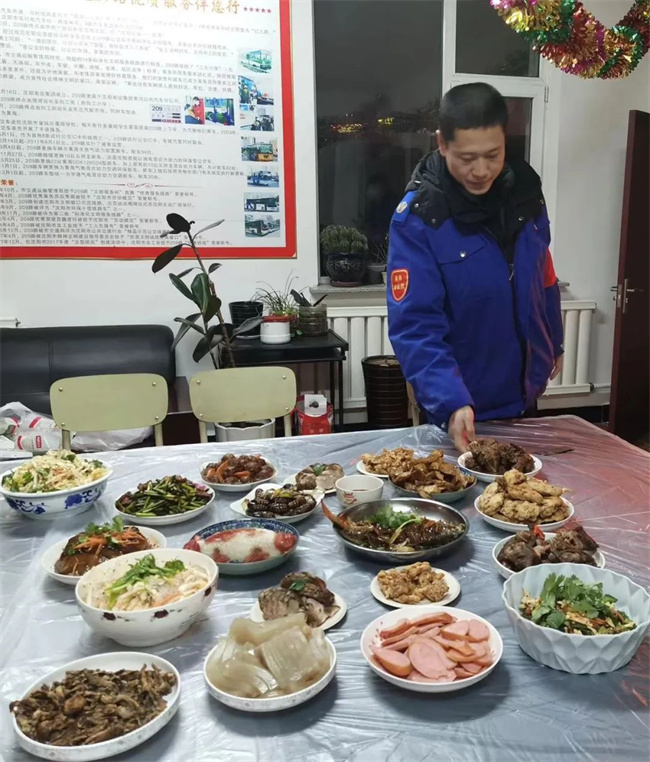 除夕當(dāng)天,各車隊(duì)為堅(jiān)守崗位的駕駛員準(zhǔn)備了豐盛的年夜飯,車隊(duì)親如一家,其樂(lè)融融。
