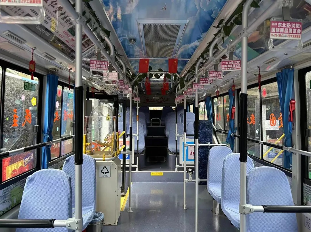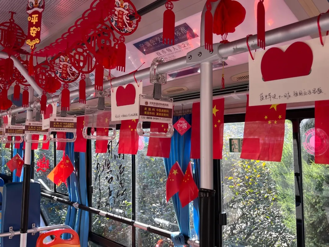 場(chǎng)面三:在沈陽(yáng)市勞動(dòng)模范、260路駕駛員繆立眾的車廂內(nèi),紅彤彤的國(guó)旗懸掛車廂兩側(cè),一句句祝福寄語(yǔ)祖國(guó),讓市民在乘車時(shí)也感受到濃厚的愛(ài)國(guó)情懷。