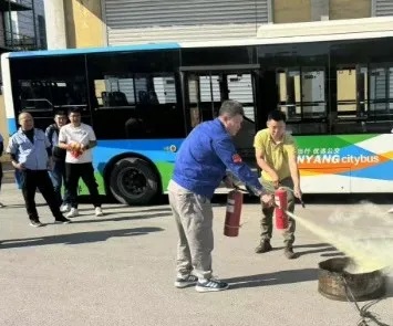 培訓(xùn)之后,在場(chǎng)人員來(lái)到公司院內(nèi)進(jìn)行實(shí)地綜合演練。針對(duì)公交車輛突發(fā)火災(zāi)、乘客攜帶易燃易爆物品乘車等情況,駕駛員如何緊急停車、疏散乘客、使用滅火器進(jìn)行撲救、處置危險(xiǎn)品等方面進(jìn)行了演練。