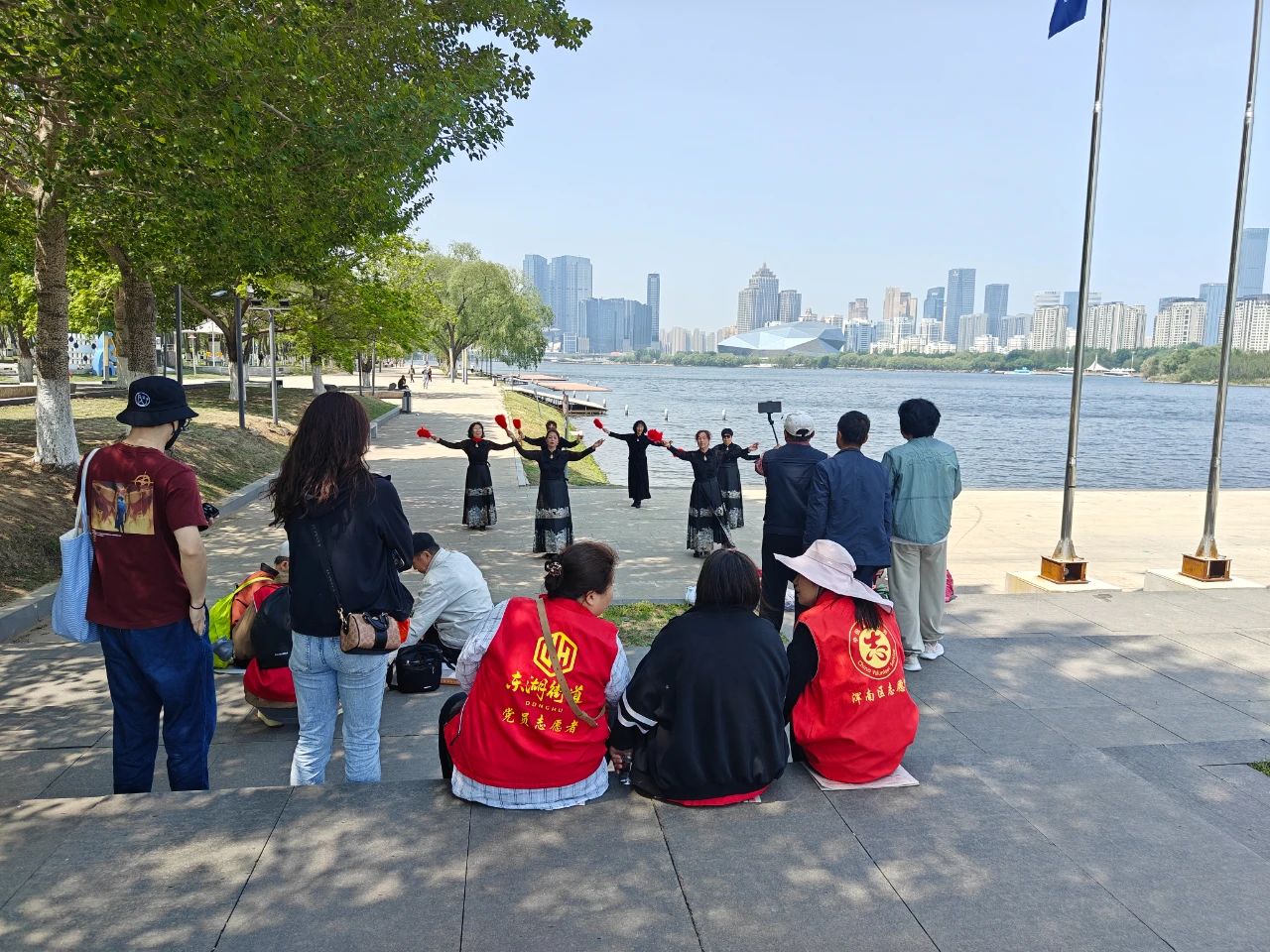當天清晨9點,載滿歡聲笑語的公交車準時出發(fā)。在奧林匹克公園河畔,老人們漫步林蔭道,賞花觀景、拍照留念,社區(qū)老年模特隊身著馬面裙,手拿紅色折扇在湖邊翩翩起舞驚艷全場,翩躚身影與粼粼波光相映成趣。返程途中,車廂化身為"流動文化站",黨員志愿者帶領老人們開展紅歌聯(lián)唱,《我和我的祖國》《沒有共產(chǎn)黨就沒有新中國》的旋律此起彼伏,溫情涌動間拉近了黨群距離。