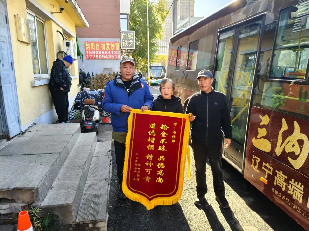 次日清晨,好消息如期而至。失主安女士手持錦旗專程趕到車隊駐地,一見到尚麒麟便緊緊握住他的手:“發(fā)現(xiàn)包不見時我急壞了!這錢是剛從銀行取出應(yīng)急用的,要是丟了真不知如何是好?!卞\旗上“拾金不昧品德高尚 道德楷模精神可貴”的金色大字,映照著她激動的面容,“太感謝尚師傅了,您幫我挽回了重大損失!”