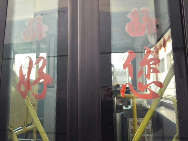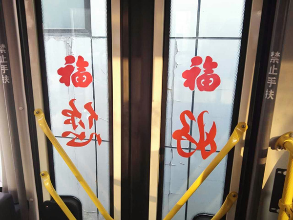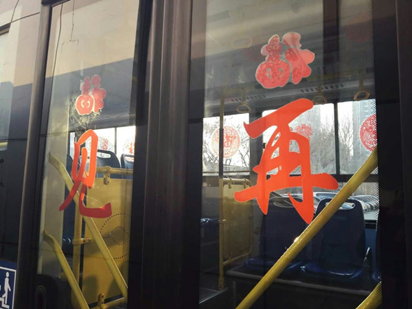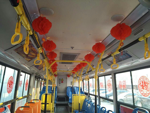 沈陽客運(yùn)集團(tuán)公司精心布置了車輛,粘貼了新年祝福標(biāo)語、福字、窗花,懸掛中國結(jié)和小燈籠,在車廂內(nèi)進(jìn)行裝飾,營造出移動的溫馨家庭感覺。