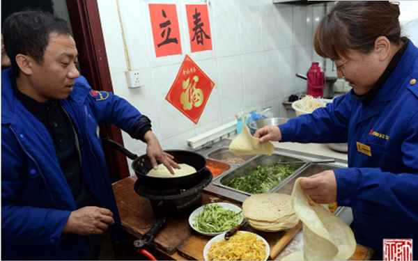 車隊齊隊長告訴記者,去年冬運開始后,沈陽各條公交線路終點站食堂為一線職工提供免費早午餐,保證駕駛員吃飽喝足再開工?!巴#绮妥龌ň?、雞蛋、粥等早點,午餐是兩素一葷,保證駕駛員營養(yǎng)充足?!饼R隊長說,初七當天是節(jié)后第一個工作日,2條線路60名駕駛員全部到崗。當天恰逢“立春”,立春是二十四節(jié)氣之首,是民間最為重視的一個節(jié)氣,這一天素有吃春餅、鞭春牛等習俗。車隊條件簡單,但為了讓大家伙感受春的氣息,讓司機一起“咬春”,車隊工作人員初六那天就采購好卷餅菜所需的食材,當天一大早就來到站房和面、烙餅。記者注意到,吃完春餅,齊隊長還給每人發(fā)了一個“平安果”,寓意新的一年平平安安。